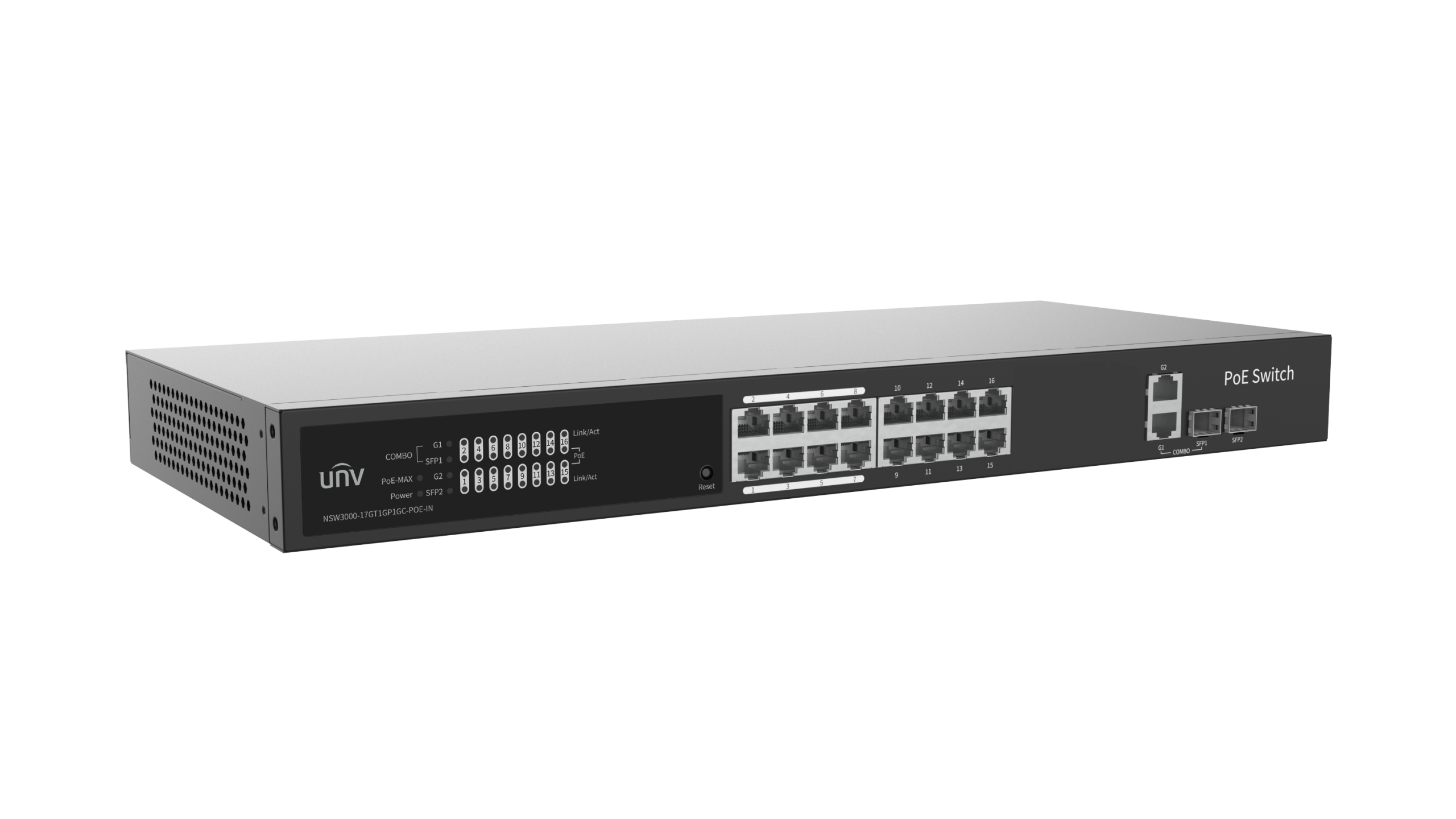 - 16 ports PoE Gigabit + 1 uplink RJ45 + 1 SFP + 1 combo Gigabit